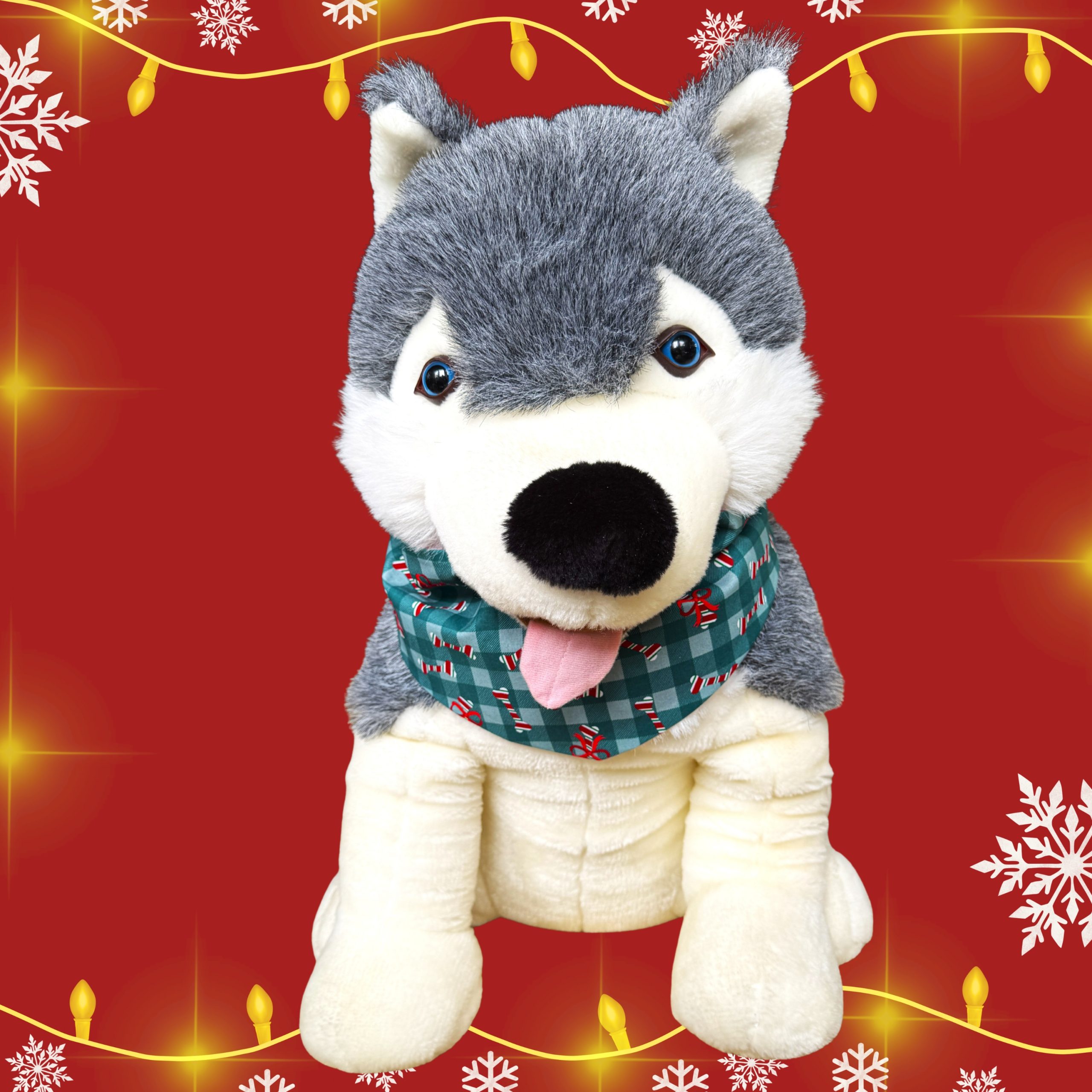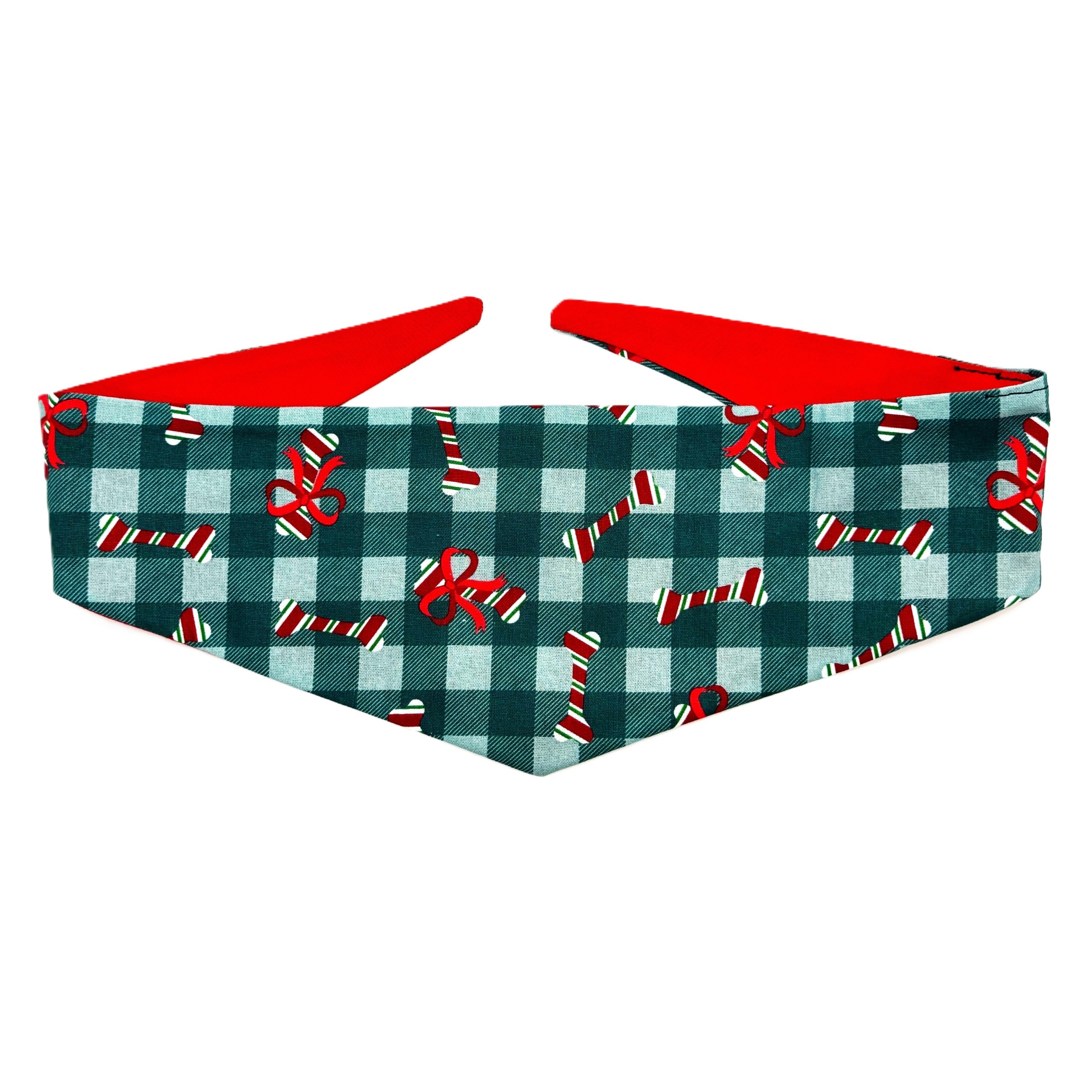 Festive Christmas Bandana in a range of sizes – Green checked pattern with dog bones. Reversible with plain red on the other side.